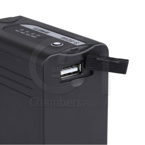Une prise d DC 5,5 / 2,1 mm est présente sur la batterie S-8D98. Vous pouvez alimenter vos accessoires et simultanément la caméra. La puissance du pôle Max est 30W, 4A .La prise Pole-tap peut également être utilisé comme entrée de charge avec le chargeur portable S-3010D.